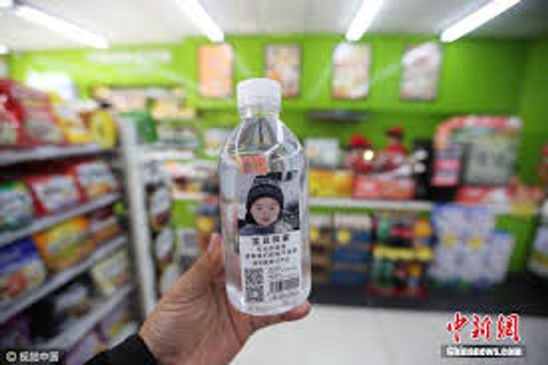ظهرت مؤخرا في بعض المتاجر بمدينة تشنغداو الصينية زجاجات مياه معدنية تم لصق صور على غطائها للأطفال المفقودين وكتابة تحتها "عد إلى البيت يا ابني".