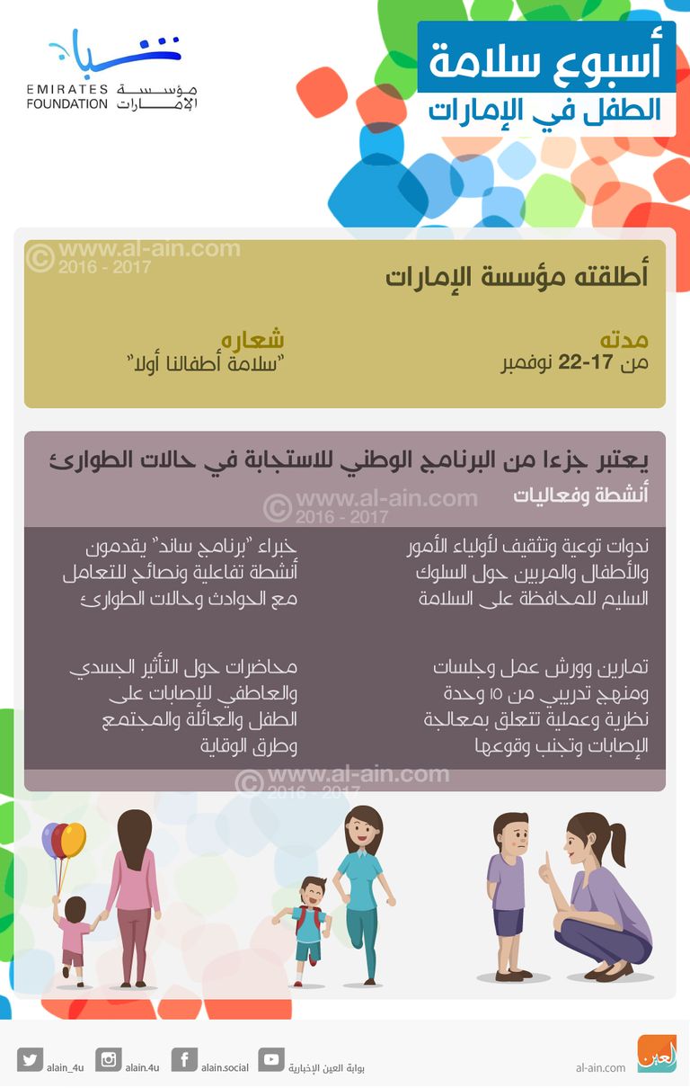 أطلقت مؤسسة الإمارات في 17 نوفمبر الحالي "أسبوع سلامة الطفل" تحت شعار "سلامة أطفالنا أولا"، ويتخلله أنشطة وفعاليات وندوات توعية وتثقيف لأولياء الأمور والأطفال.