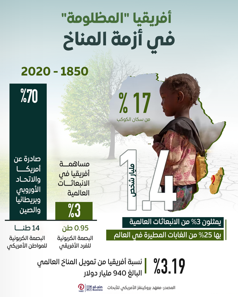 تعد أفريقيا قارة المتناقضات في قضية تغير المناخ، ما يقرب من 1.4 مليار شخص (17% من سكان العالم) يمثلون 2 إلى 3% فقط من الانبعاثات العالمية من الطاقة والصناعة، وفقًا للأمم المتحدة.