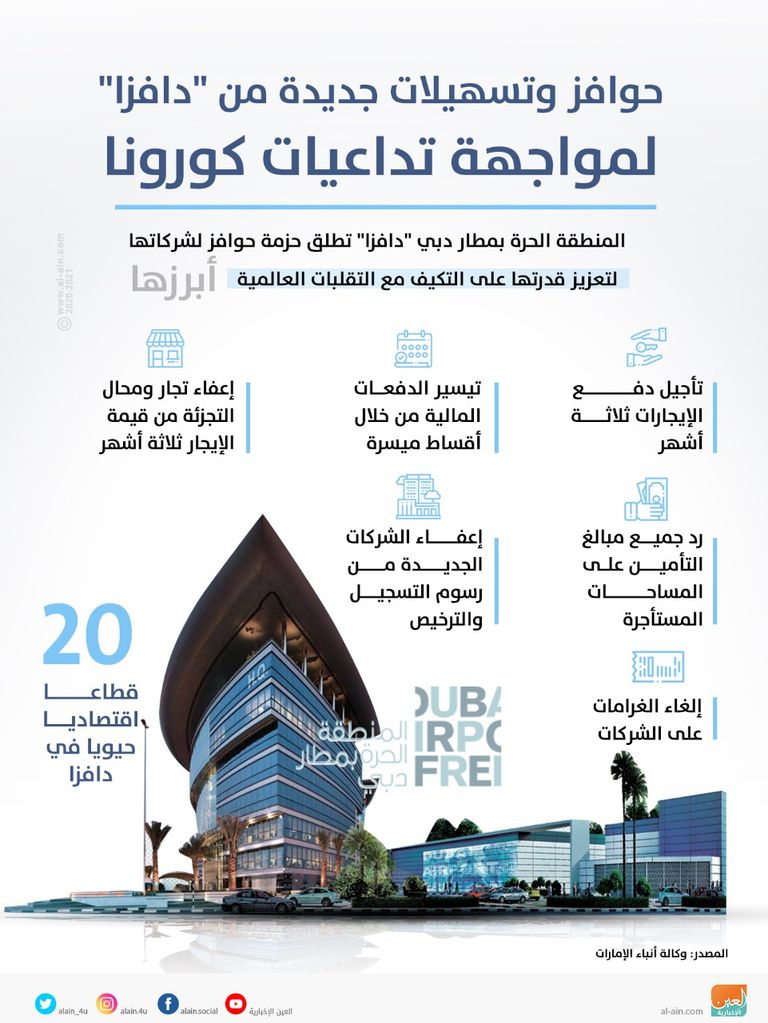 أعلنت سلطة المنطقة الحرة بمطار دبي "دافزا" عن حزمة حوافز وتسهيلات، دعما لشركاتها وذلك حرصا على استمرارية أعمالها في شتى القطاعات الاقتصادية التي تعمل بها، وذلك تخفيفا من حدة التأثيرات الاقتصادية والإجراءات الاحترازية لما يشهده العالم في هذه الفترة.