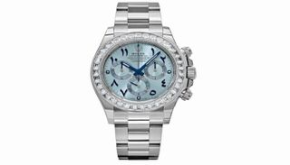 وهذه الساعة المصنوعة من البلاتين يُميّزها ميناؤها الأزرق الثلجي، وهي علامة رولكس الخاصة بالساعات ذات العلبة البلاتينية. وقد نسّق بيكهام لون الميناء مع قميص أزرق، كعادته في تناغم الإطلالة.