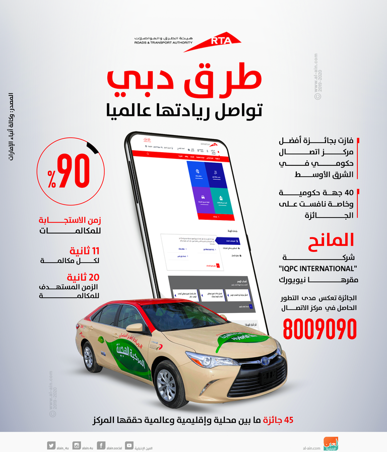فازت هيئة الطرق والمواصلات في دبي بجائزة أفضل مركز اتصال حكومي، والتي تمنحها شركة (IQPC INTERNATIONAL) ومقرها نيويورك، وذلك خلال مؤتمر أسبوع التميز في تجربة المتعاملين في الشرق الأوسط في دبي.