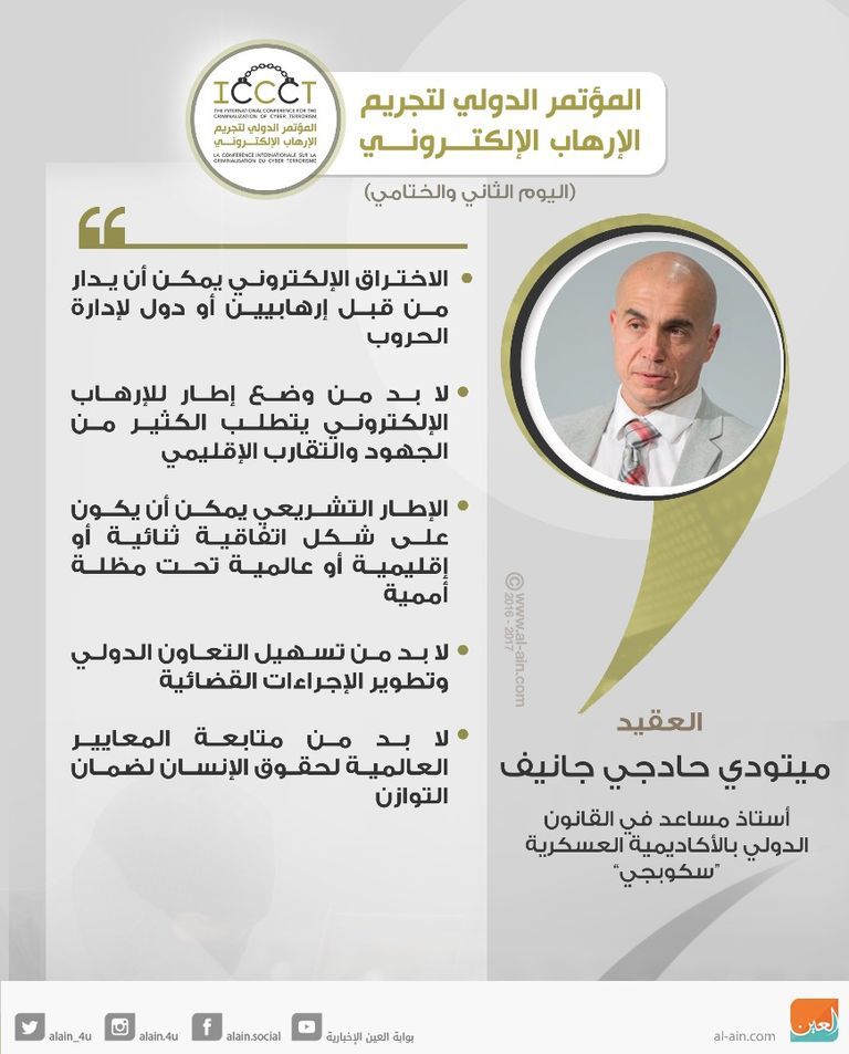 جاء ذلك في كلمة له أمام المؤتمر الدولي لتجريم الإرهاب الإلكتروني، الذي يُختتم اليوم الثلاثاء، في العاصمة أبوظبي.، والإنفوجراف التالي يتناول أبرز ما أدلى به جانيف.
