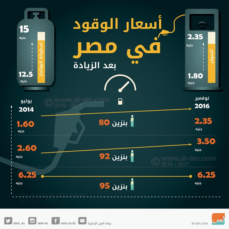 بوابة "العين" الإخبارية تقدم إنفوجراف أسعار الوقود في مصر بعد قرار الحكومة، ليل الخميس/الجمعة، زيادتها وبدء تطبيقها في أنحاء البلاد