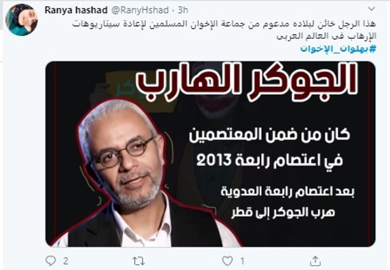 وقالت ناشطة أخرى تدعى "رانيا حشاد": "هذا الرجل خائن لبلاده مدعوم من الإخوان لإعادة سيناريوهات الإرهاب في العالم العربي".