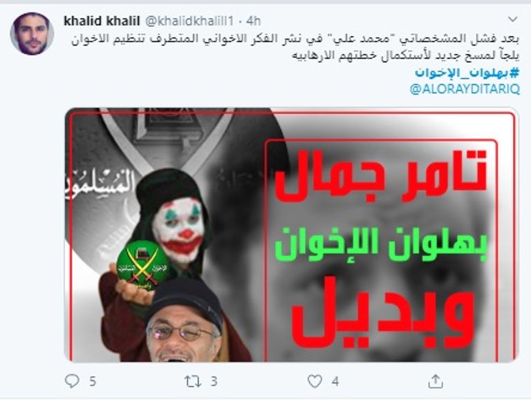 ودشن نشطاء على تويتر وسم بعنوان:"#بهلوان_الإخوان" و"#أراجوز_الإخوان" للسخرية من تامر جمال الذي يصفونه بشخصية "الجوكر"، وللرد على أكاذيب تنظيم الإرهاب الممول من قطر وتركيا.