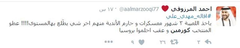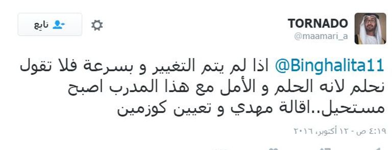 واتفق معظم المغردين الإماراتيين على ضرورة إقالة مهدي علي من قيادة المنتخب بعد المستوى الضعيف الذي ظهر عليه المنتخب أمام السعودية وانهياره في الربع ساعة الأخيرة بشكل كبير، مؤكدين أن علي لم يعد الرجل المناسب للمرحلة القادمة.