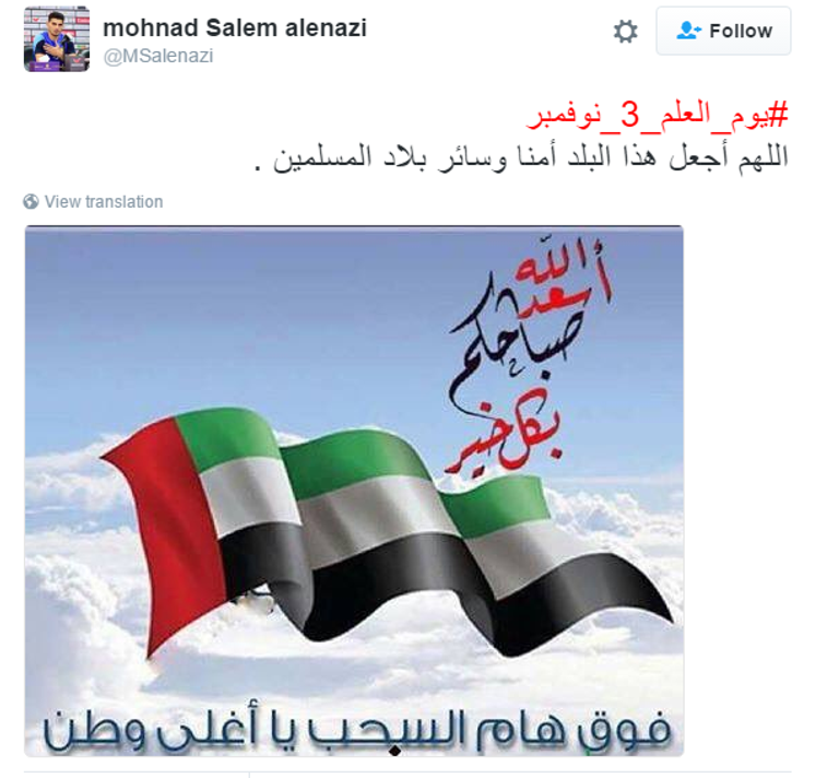 شارك نجوم المنتخب الإماراتي وعدد من الإعلاميين الرياضيين البارزين في احتفالات الدولة بيوم العلم الموافق الثالث من نوفمبر، بتغريدات حول المناسبة على حساباتهم الشخصية بموقع التواصل الاجتماعي "تويتر".