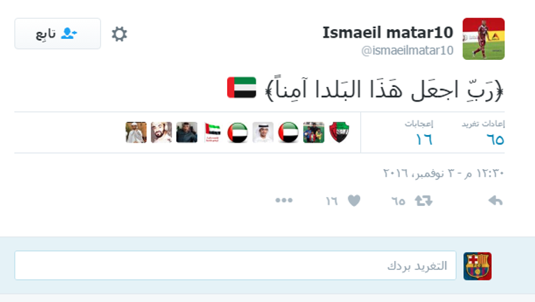 واتفق كل من عموري لاعب العين، وزميله مهند العنزي، وإسماعيل مطر لاعب الوحدة، والمعلق الرياضي علي سعيد الكعبي في تغريداتهم على تمني أن يديم الله نعمة الأمن والأمان على دولة الإمارات.