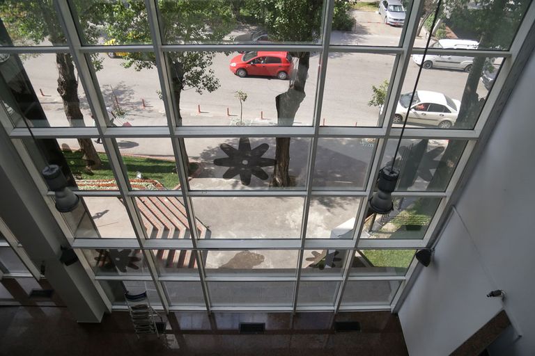 الواجهة الخارجية لمبنى مركز الفن المعاصر وأدناه تبدو الواجهة عينها ليلة الإعتداء، ويظهر القاتل بلقطة خارجية وهو يهدد زوار المعرض بسلاحه:
