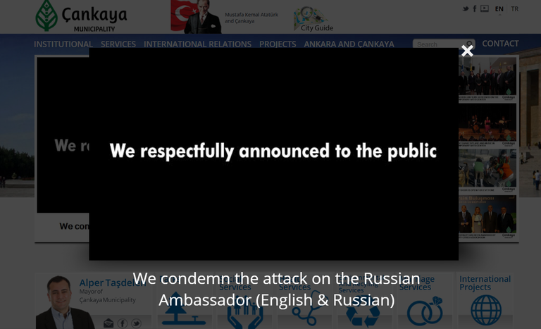 في حين تتصدر الصفحة الأولى لبلدية تشانكي في أنقرة، حيث يقع مركز الفن وتقام فعالياته بالتعاون معها، رسالة تنديد وشجب لعملية الاغتيال التي راح ضحيتها السفير الروسي.