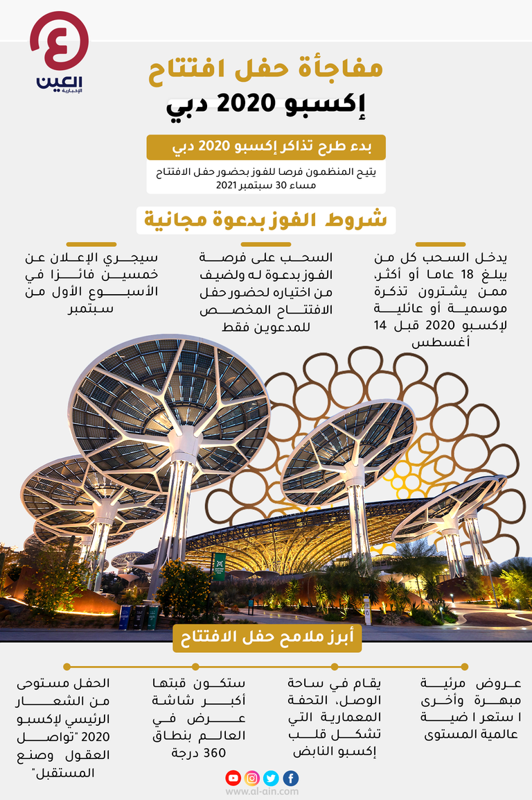 وسيدخل كل من يبلغ عمره 18 عاماً أو أكثر، ممن يشترون تذكرة موسمية أو عائلية لـ"إكسبو 2020" قبل 14 أغسطس المقبل، السحب للحصول على فرصة الفوز بدعوة له ولضيف من اختياره لحضور حفل الافتتاح المخصص للمدعوين فقط مساء 30 سبتمبر 2021.