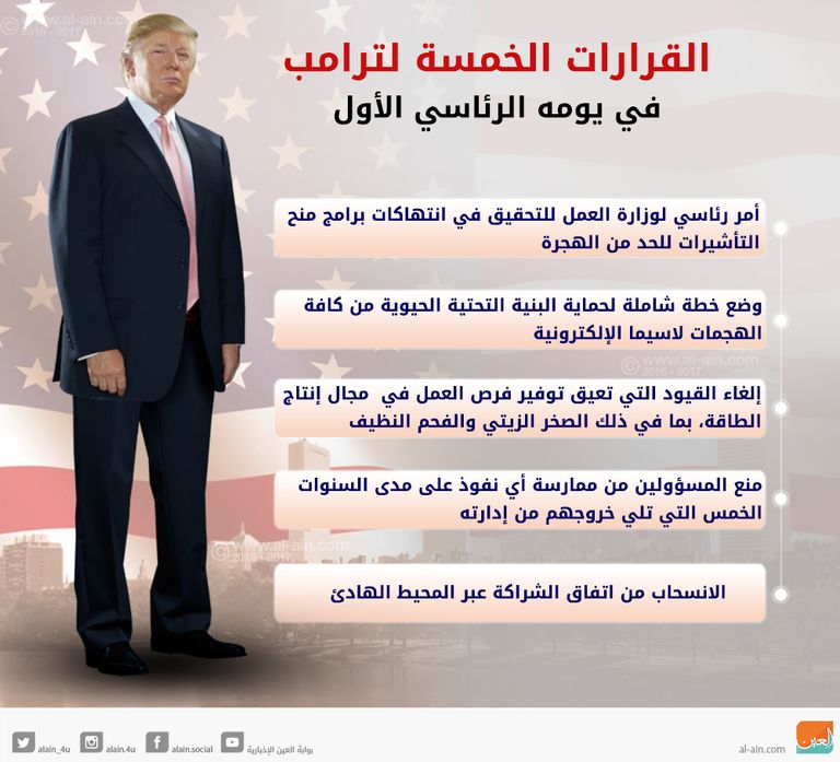 إنفوجراف.. القرارات الخمسة لترامب في يومه الرئاسي الأول