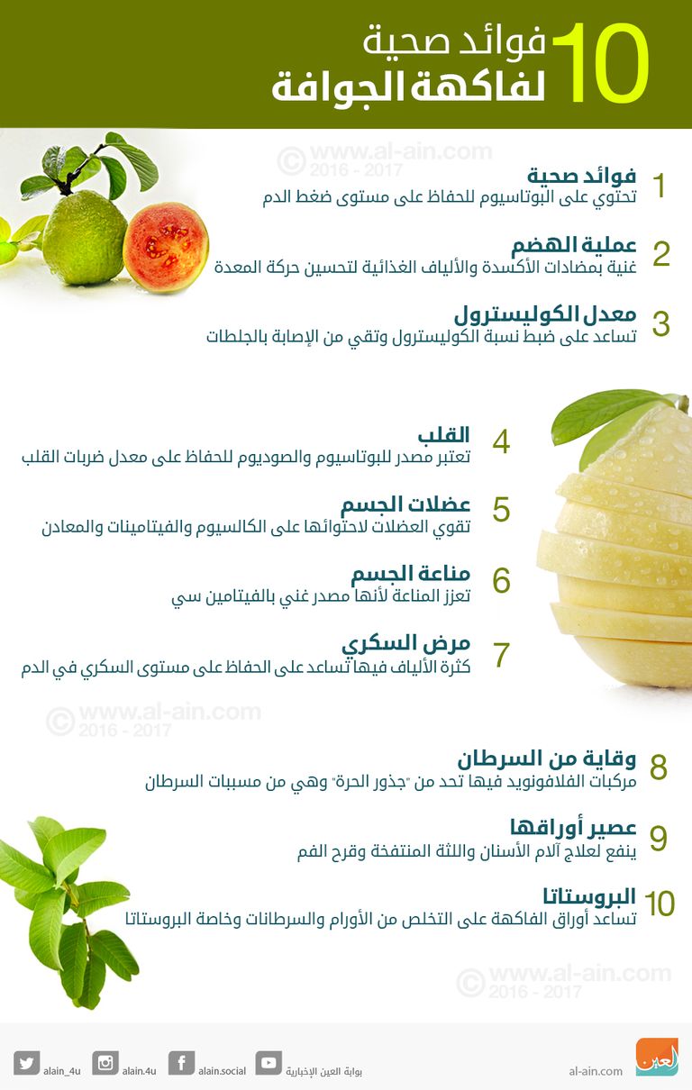 إنفوجراف يحتوي على معلومات صحية مهمة حول فوائد تناول فاكهة الجوافة يومياً