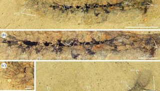 واحتوت هذه العينة على ما وصفه الباحثون بأنه "بقع متناظرة" على طول الجزء الأوسط من هذا المخلوق، ولاحظ الباحثون أنها تشبه جزءاً من الجهاز العصبي المركزي في المفصليات الحديثة.