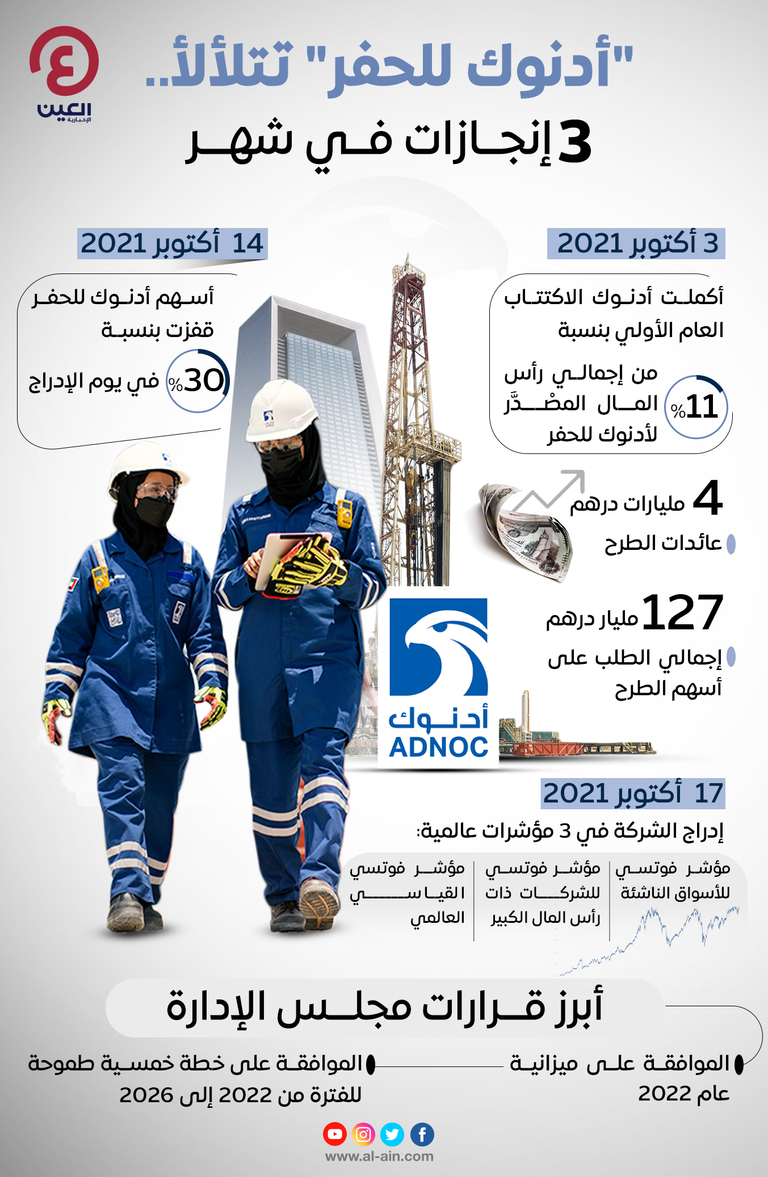 وكانت أدنوك قد أكملت بنجاح الاكتتاب العام الأولي بنسبة 11% من إجمالي رأس المال المصْدَر في أدنوك للحفر في سوق أبوظبي للأوراق المالية في 3 أكتوبر/تشرين الأول 2021. واستطاع الطرح تحقيق عائدات إجمالية تزيد على 4 مليارات درهم، في حين تجاوزت تغطية الطرح 31 ضعف القيمة المستهدفة مع طلب إجمالي على أسهم الطرح العام بلغ 127 مليار درهم.