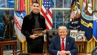 واصطحب ترامب كريستيانو وخطيبته جورجينا رودريغيز في جولة في مكتبه، وقدم له هدية تذكارية بهذه المناسبة.