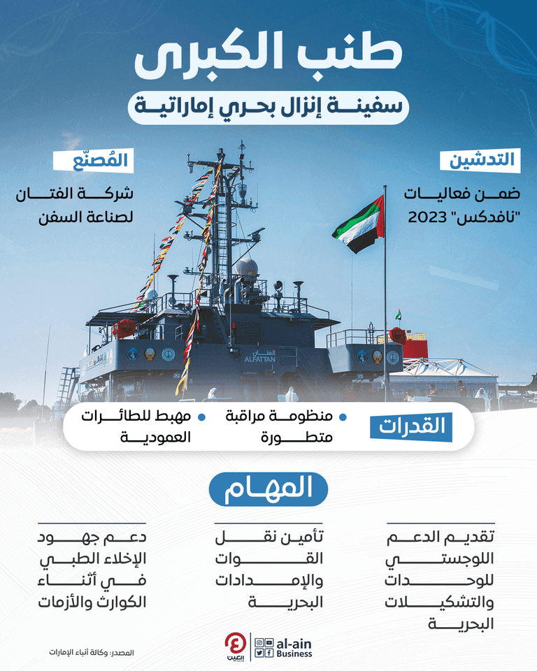 وتؤدي سفينة "طنب الكبرى"، التي جرى تصنيعها محليا من قِبَل شركة الفتان لصناعة السفن، عدداً من المهام، من أبرزها تقديم الدعم اللوجستي للوحدات والتشكيلات البحرية، وتأمين نقل القوات والإمدادات البحرية، ودعم جهود الإخلاء الطبي في أثناء الكوارث والأزمات.