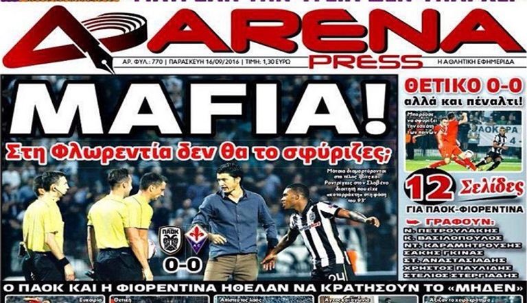 اتهمت صحيفة يونانية عصابات المافيا الإيطالية بالتأثير على نتيجة مباراة فريق باوك سالونيكي اليوناني وضيفه فيورنتينا الإيطالي في الجولة الأولى من دور المجموعات ببطولة الدوري الأوروبي (الخميس)، والتي انتهت بالتعادل السلبي.