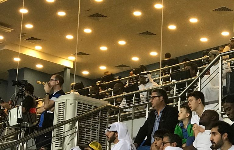 تواجد الغاني أسمواه جيان لاعب النادي الأهلي الإماراتي في المقصورة الرئيسية لستاد آل مكتوم خلال لقاء النصر والعين في الجولة الرابعة من دوري الخليج العربي.