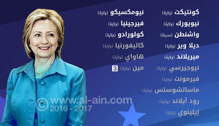 أما هيلاري كلينتون، المرشحة الديمقراطية لانتخابات الرئاسة الأمريكية، ففازت في 17 ولاية، هي: واشنطن، ديلاوير، ميريلاند، نيوجيرسي، فيرمونت، ماساتشوستس، رودآيلاند، إيلينوي، نيويورك، كونيتكوت، نيومكسيكو، فيرجينيا، كولورادو، هاواي، كاليفورنيا، أوريغون، ونيفادا حتى الآن.