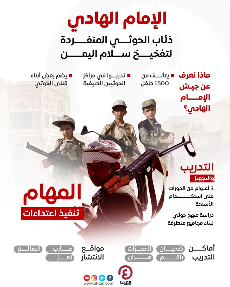 وشكّلت المليشيات فكر الأطفال المجندين ضمن ما سمته "جيش الإمام الهادي"، وفق عقيدة تقدس الموت دفاعا عن زعيم المليشيات عبدالملك الحوثي؛ باعتباره من يقوم بحماية إرث النبي محمد (صلى الله عليه وسلم)، والمكلف بمواصلة ما تسمى "مسيرة القرآن" وصولا إلى السيادة لزعيم الحوثيين على الأمة الإسلامية، بحسب المعلومات التي حصلت عليها "العين الإخبارية".