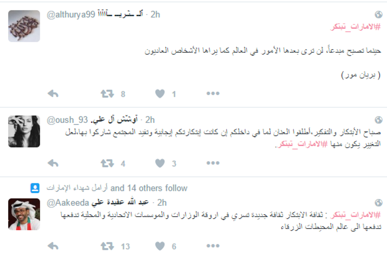 تصدر هاشتاغ "الإمارات تبتكر" ترند موقع التواصل الاجتماعي تويتر في الإمارات، وذلك تزامناً مع انطلاق "أسبوع الإمارات للابتكار 2016" في دورته الثانية، لتحتفي إمارات الدولة بكل مدنها ومناطقها بالمبتكرين وأفكارهم المتميزة على مدار 7 أيام من 20 إلى 26 نوفمبر/تشرين الثاني.