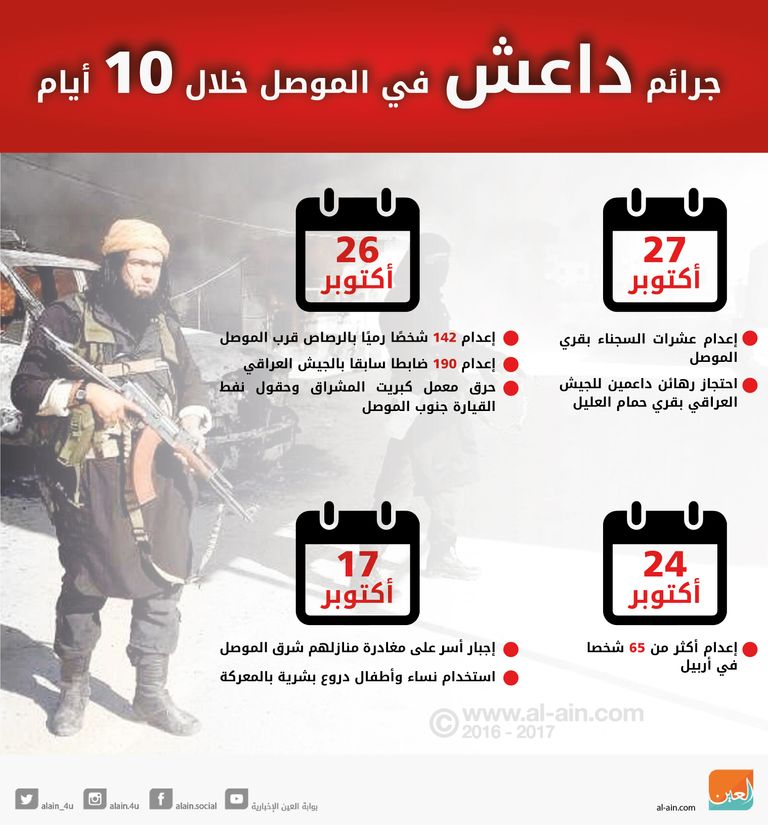 الإنفوجراف التالي يرصد جرائم التنظيم الإرهابي في معركة الموصل خلال 10 أيام.