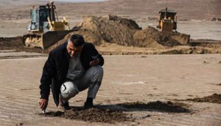 في عمق الصحراء الجنوبية للعراق، تعمل الجرافات والآليات الثقيلة على فرد طبقات من الطين الرطب فوق الكثبان الرملية.