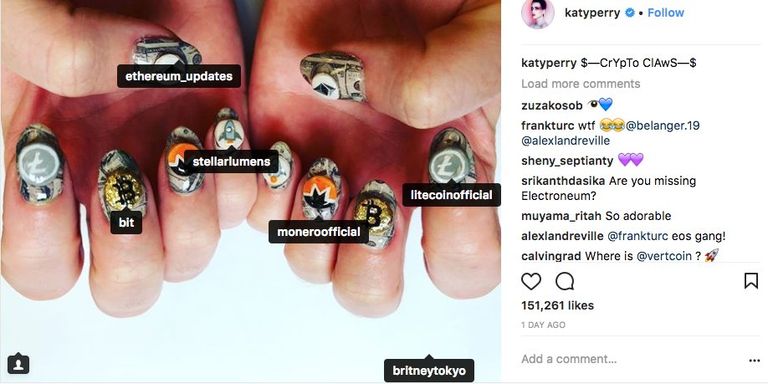 وذكرت صحيفة "إندبندت" البريطانية أن كاتي بيري عرضت صورا لأظافرها على موقع أنستقرام وهي مطلية برسومات مستوحاة من "بيتكوين"، وأطلقت عليها اسم" مخالب مشفرة".