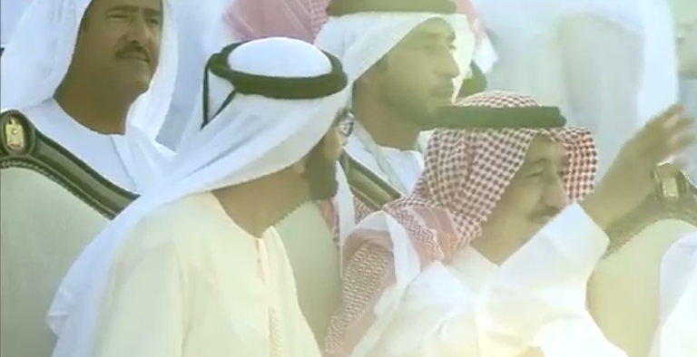 خادم الحرمين الشريفين، الملك سلمان بن عبدالعزيز آل سعود، والشيخ محمد بن راشد آل مكتوم، والشيخ محمد بن زايد آل نهيان، يشاركون في مهرجان الشيخ زايد التراثي بأبوظبي.
