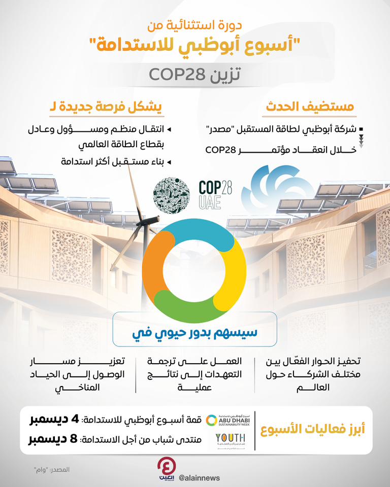 وستقام قمة أسبوع أبوظبي للاستدامة في 4 ديسمبر/كانون الأول في مركز "كونكت" للمؤتمرات في مدينة إكسبو بدبي تحت شعار "معاً لتعزيز العمل المناخي خلال "COP28"، وستجمع نخبة من قادة الفكر من القطاع العام والمجتمع المدني وقطاعات الأعمال مثل الاستثمار والتمويل، وذلك بهدف تحديد السبل الكفيلة بتسريع تحقيق انتقال عادل وشامل في قطاع الطاقة والوصول إلى الحياد المناخي في المستقبل.