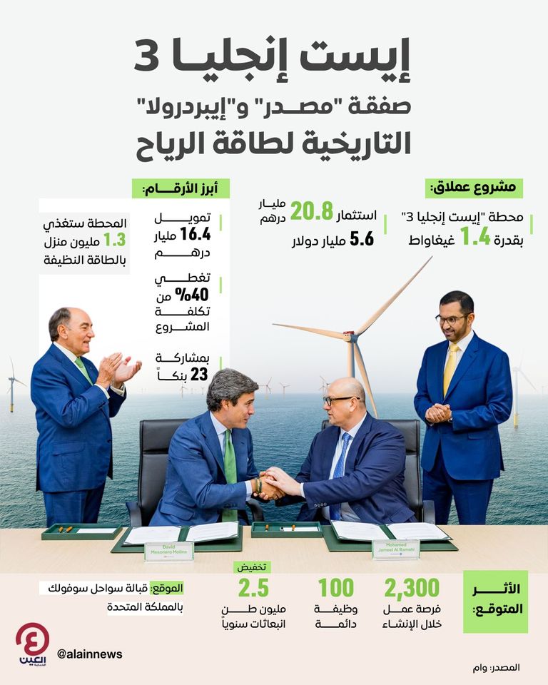 وكانت "مصدر" و"إيبردرولا" قد أعلنتا خلال الشهر الجاري عن استثمار مشترك في مشروع "إيست إنجليا 3"، حيث ستمتلك كل منهما حصة 50%، مع شراكة في إدارة المحطة البالغة قدرتها 1.4 غيغاواط، والتي من شأنها الإسهام في دعم تحقيق طموحات أوروبا في مجال طاقة الرياح البحرية. وتقع محطة "إيست إنجليا 3" قبالة سواحل سوفولك بالمملكة المتحدة.