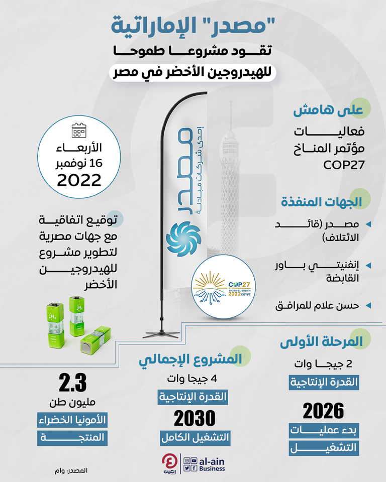 كان ائتلاف الشركات الذي تقوده "مصدر" قد وقّع مذكرتي تفاهم في شهر أبريل الماضي مع الجهات المصرية المعنية للتعاون في تطوير محطتين لإنتاج الهيدروجين الأخضر، واحدة في المنطقة الاقتصادية لقناة السويس، وأخرى على ساحل البحر الأبيض المتوسط. ويسعى الائتلاف لإنتاج ما يصل إلى 480 ألف طن من الهيدروجين الأخضر سنوياً، من خلال محللات كهربائية بقدرة 4 جيجا وات بحلول عام 2030.