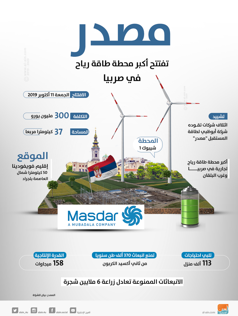 افتتح ائتلاف شركات تقوده شركة أبوظبي لطاقة المستقبل "مصدر" التابعة لشركة "مبادلة للاستثمار"، الجمعة، محطة "شيبوك 1"، أكبر محطة طاقة رياح تجارية على مستوى المرافق الخدمية في صربيا ومنطقة غرب البلقان، بحضور الرئيس الصربي ألكسندر فوسيتش والدكتور ثاني بن أحمد الزيودي وزير التغير المناخي والبيئة الإماراتي.