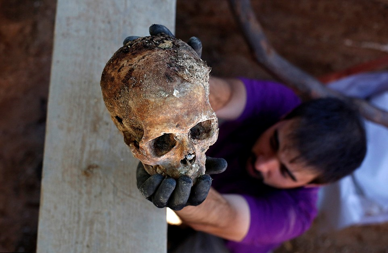 عالم الآثار جونزالو سايز، يحمل جمجمة لإنسان تم العثور عليها مدفونة في حفرة لا تحمل علامات لبلد الوليد.