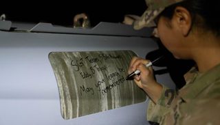 صورة لجندي أمريكي نشرتها وزارة الدفاع الأمريكية وهو يكتب رسالة على قنبلة قبيل إطلاق نحو أهداف لداعش في سوريا.