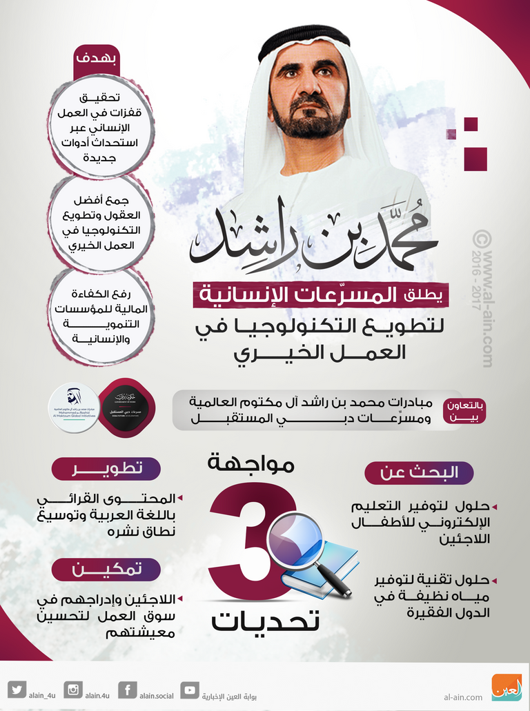 أطلق الشيخ محمد بن راشد آل مكتوم نائب رئيس دولة الإمارات رئيس مجلس الوزراء حاكم دبي "المسرعات الإنسانية"، التي تعد الأولى من نوعها في العالم العربي والتي تهدف لجمع أفضل العقول وتطويع التكنولوجيا المتقدمة لتحقيق قفزات في العمل الإنساني من خلال استحداث أدوات جديدة وحلول مبتكرة للتعامل مع هذه التحديات الإنسانية والتنموية والمعرفية ورفع الكفاءة المالية للمؤسسات التنموية والإنسانية في تحقيق أهدافها بطرق أكثر فاعلية.