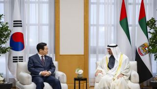 جاء ذلك خلال جلسة المحادثات الرسمية التي عقدها الشيخ محمد بن زايد آل نهيان في قصر الوطن مع رئيس كوريا الجنوبية الذي يقوم "بزيارة دولة" إلى دولة الإمارات.