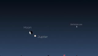 وسيُطلّ القمر، الذي يكون قد تجاوز طور التربيع الأخير بساعات قليلة، فوق الأفق الشرقي الشمالي الشرقي قبيل منتصف الليل، بينما سيظهر إلى يمينه مباشرة كوكب المشتري، ألمع كواكب النظام الشمسي، على بُعد نحو 6 درجات فقط ، أي أقل من نصف عرض قبضة اليد الممدودة نحو السماء.