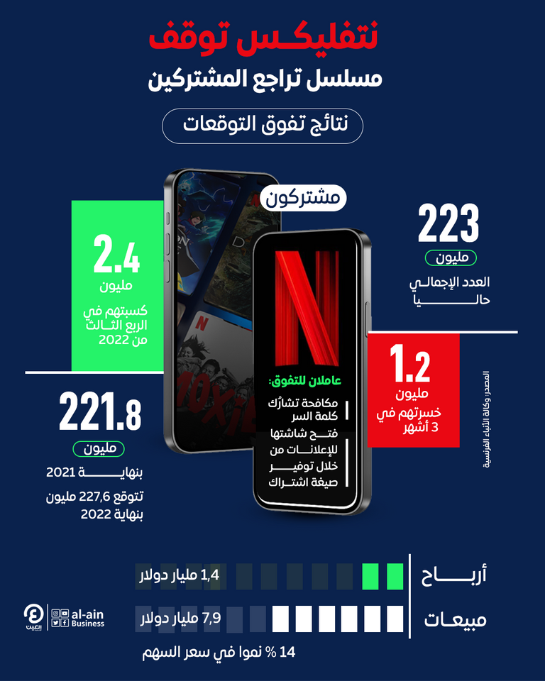 وارتفع العدد الإجمالي لمشتركي نتفليكس إلى أكثر من 223 مليوناً، محطّمة بذلك الرقم القياسي الذي حققته في نهاية 2021 وهو 221,8 مليون مشترك نتيجة انعكاسات جائحة كوفيد-19 الإيجابية جداً على المنصات الترفيهية.