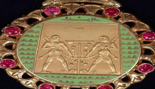 وللقلادة حلية تتصل بالسلسلة بمشبك على شكل زهرتي لوتس، والحلية ذات شكل دائري ومحلاة بزهرات فرعونية وبالميناء وبالفصوص الحمراء والزرقاء، وفي وسطها رسم بارز يمثل رمز النيل موحدًا بين الشمال الذي يمثله البردي والجنوب الذي يمثله زهرة اللوتس.