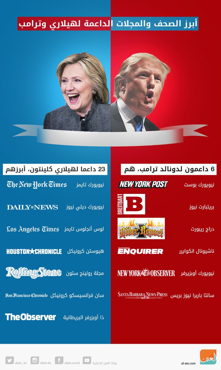 تعرف من خلال هذا الإنفوجراف على أبرز الصحف والمجلات الداعمة لكل من هيلاري كلينتون ودونالد ترامب في انتخابات الرئاسة الأمريكية