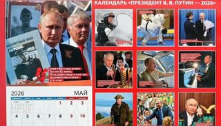وفي أحد التقويمات، يظهر بوتين في شهر يناير/كانون الثاني على دراجة ثلجية مع اقتباس يقول فيه "حدود روسيا لا تنتهي أبدًا".