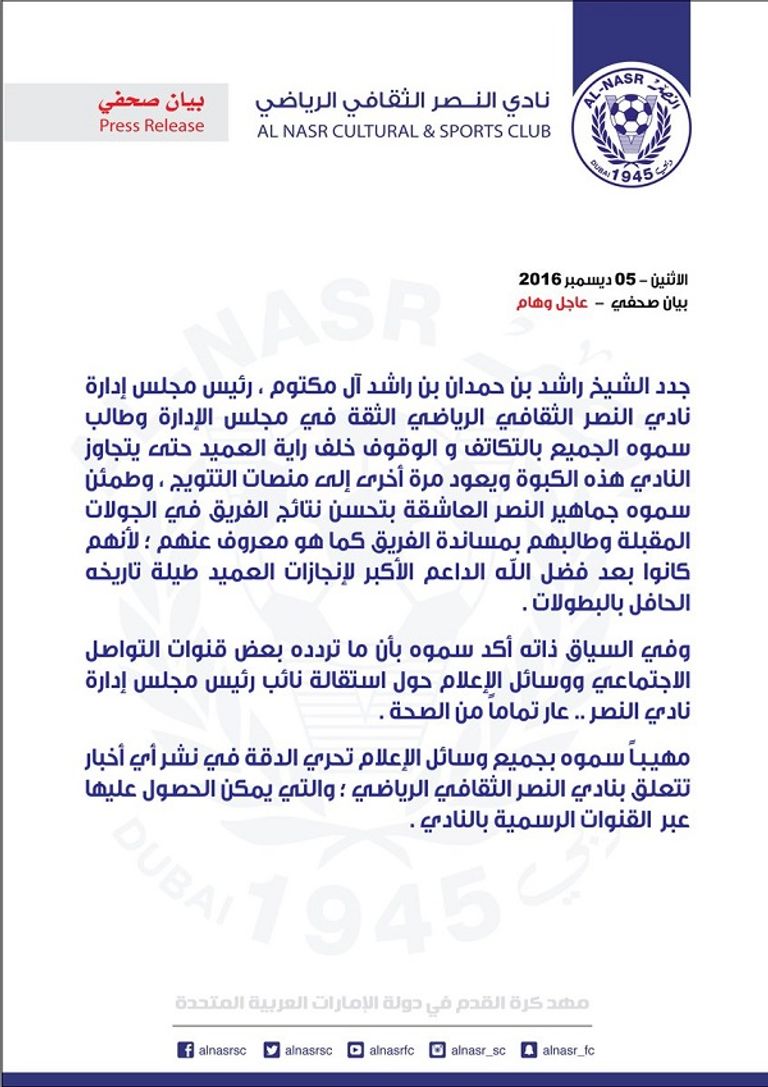 جدد الشيخ راشد بن حمدان بن راشد آل مكتوم رئيس مجلس إدارة نادي النصر الإماراتي الثقة في مجلس إدارة النادي، وذلك عقب الشائعات التي ترددت عن إستقالة نائب رئيس مجلس الإدارة أحمد خوري.