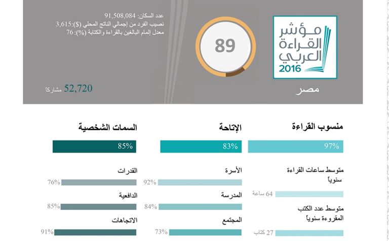 مصر حصدت المركز الثاني مسجلة 89 درجة وبلغ منسوب القراءة فيها 97% وبلغ متوسط ساعات القراءة سنوياً 64 ساعة، وبلغ متوسط عدد الكتب المقروءة سنوياً 26 كتاباً.