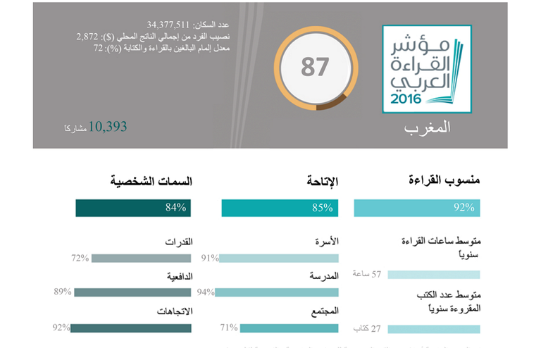 المغرب جاء في المركز الثالث مسجلاً 87 درجة وبلغ منسوب القراءة فيه 92% وبلغ متوسط ساعات القراءة سنوياً 57 ساعة، وبلغ متوسط عدد الكتب المقروءة سنوياً 27 كتاباً.