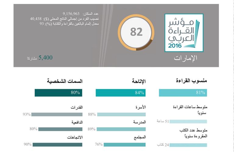 وحصدت الإمارات المركز الرابع مسجلة 82 درجة وبلغ منسوب القراءة فيها 81 % وبلغ متوسط ساعات القراءة سنوياً 51 ساعة، وبلغ متوسط عدد الكتب المقروءة سنوياً 24 كتاباً.