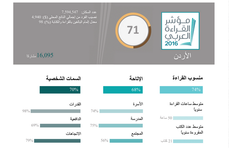 أما الأردن فجاءت في المركز الخامس مسجلة 71 درجة وبلغ منسوب القراءة فيها 74% وبلغ متوسط ساعات القراءة سنوياً 50 ساعة، وبلغ متوسط عدد الكتب المقروءة سنوياً 21 كتاباً.
