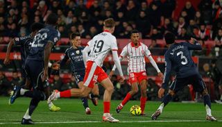 ويرى جمهور ريال مدريد أن البرازيلي رودريغو غوس مهاجم الميرينغي الذي عاني فنياً هذا الموسم كان يستحق ركلة جزاء بسبب تدخل عنيف عليه من جويل روكا.